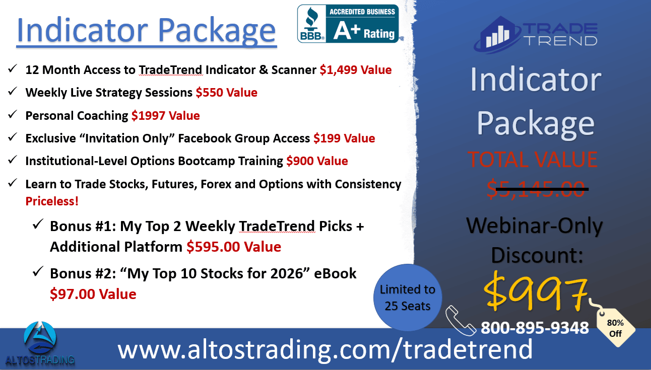 Trading securities and options involves risk. Prior to buying or selling an option, an investor must receive a copy of Characteristics and Risks of Standardized Options. Investors need a broker to trade securities and options, and must meet suitability requirements. Past results are not necessarily indicative of future performance. Performance figures are based on actual alerts provided in the TradeTrend software. Due to the time critical nature of trading, brokerage fees, and the activity of other subscribers, there is no guarantee that subscribers will mirror the performance of the service. Past performance numbers shown are based on trades subscribers could enter based on the trade alerts. Altos Trading, LLC assumes no responsibility for any losses incurred by any individual or entity as a result of trade alerts or strategies taught through TrendTrend.com or TradeTrend Software.